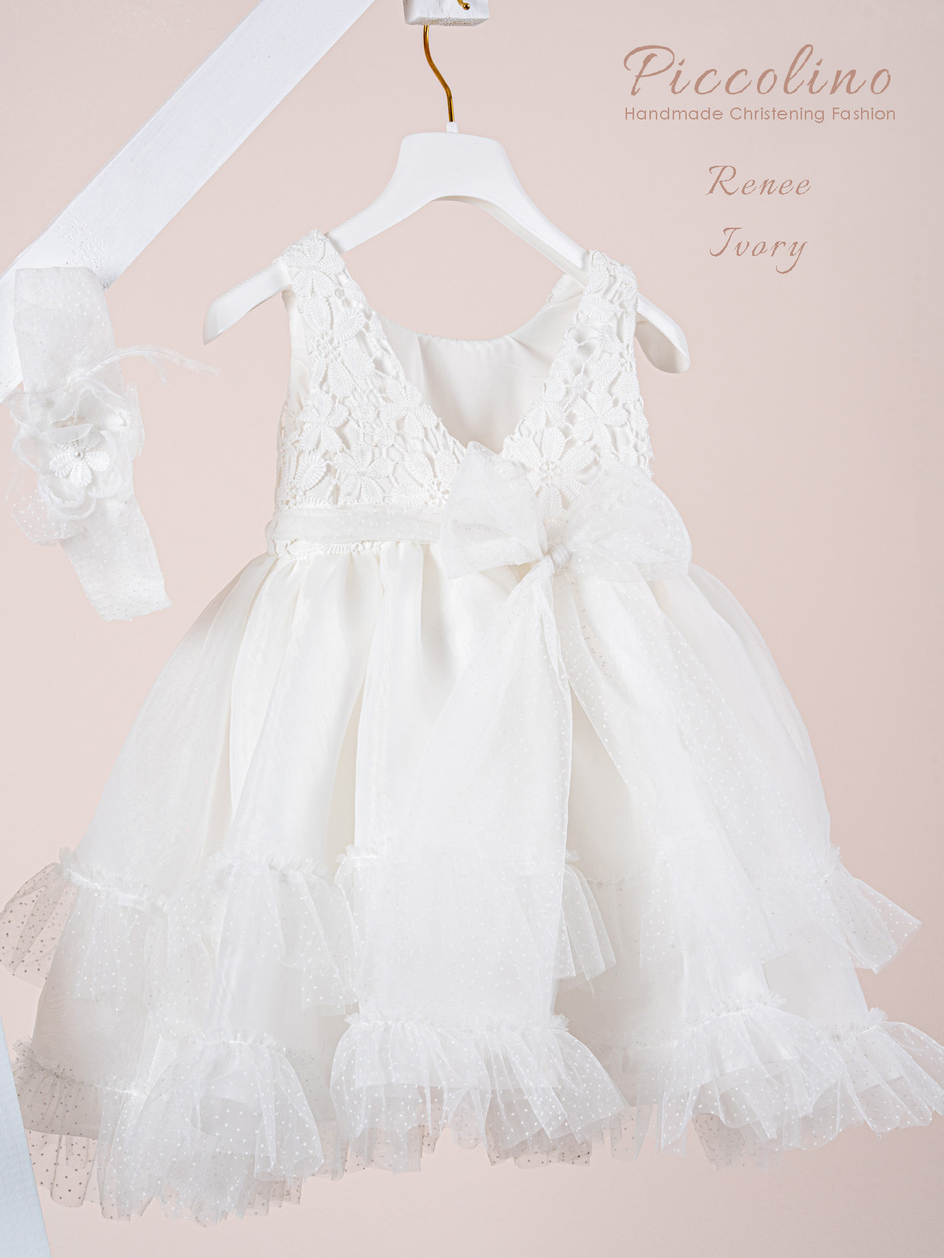 Βαπτιστικό φόρεμα Piccolino Renee Ivory. Ρομαντικό μεσάτο φόρεμα με μπούστο από εντυπωσιακή δαντέλα με λουλούδια και πλούσια φούστα από οργάντζα με βολάν από πουά τούλι. Το ντεκόρ του φορέματος αποτελείται από σύνθεση με λουλούδια της δαντέλας και ζωνάκι από πουά τούλι που καταλήγει σε φιόκο στο πίσω μέρος. Το φόρεμα συνοδέυεται απο κορδέλα με ντεκόρ όμοιο με το φόρεμα.