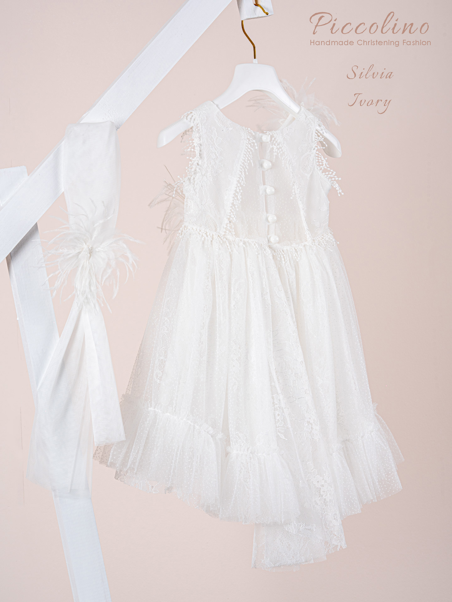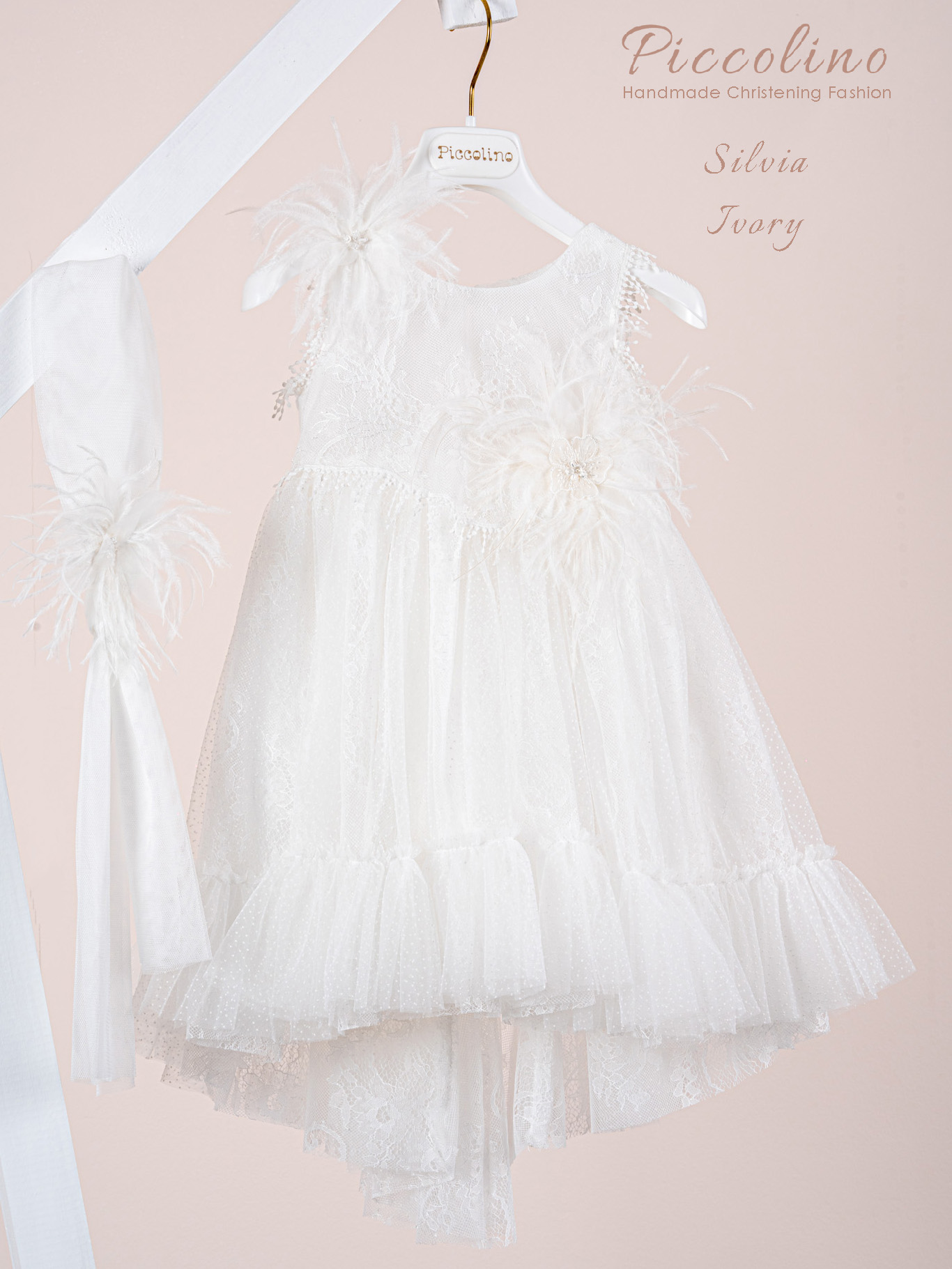 Βαπτιστικό φόρεμα Piccolino Silvia Ivory. Φόρεμα από δαντέλα εξωτερικά και τούλι με ψιλό πουά εσωτερικά. Μπούστο με ιδιαίτερο κόψιμο που καταλήγει σε μύτη μέσα στην φόυστα. Ιδιαίτερη πλάτη με εντυπωσιακό άνοιγμα κάνοντας ελαφρυά διαφάνεια με το πουά τούλι. Ασσύμετρη φούστα με βολάν, μακρυά στο πίσω μέρος. Δαντέλα με κρόσια διακοσμεί τα τελειώματα στο μπούστο. Το ντεκόρ του φορέματος αποτελείται από χειροποίητα λουλούδια και πούπουλα μαραμπου. Το φόρεμα συνοδέυεται απο μπαντάνα με ντεκόρ όμοιο με το φόρεμα.