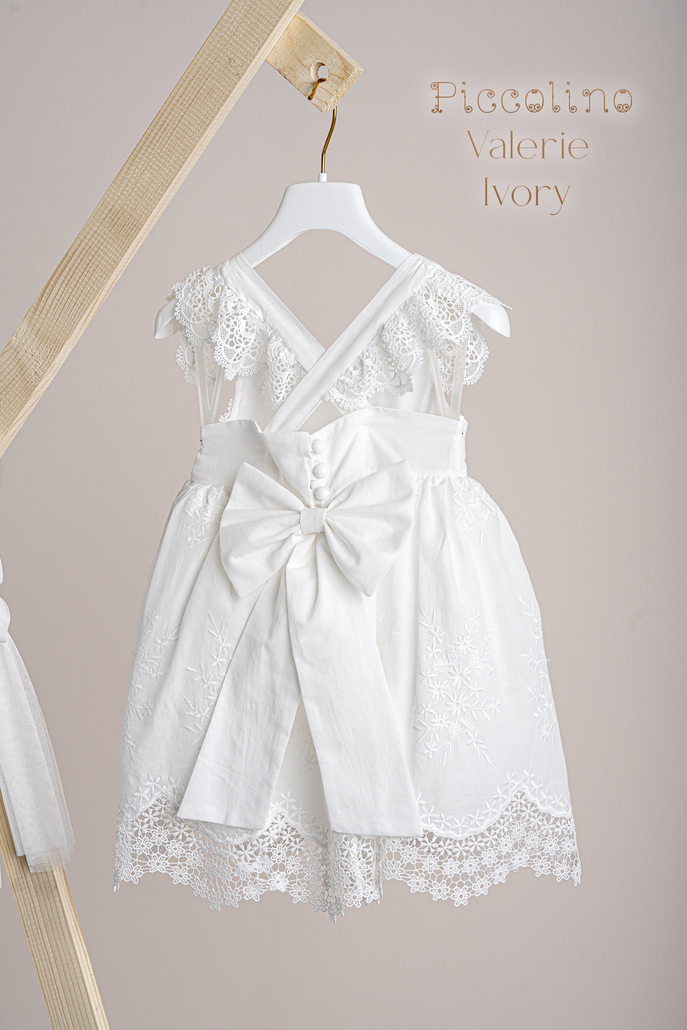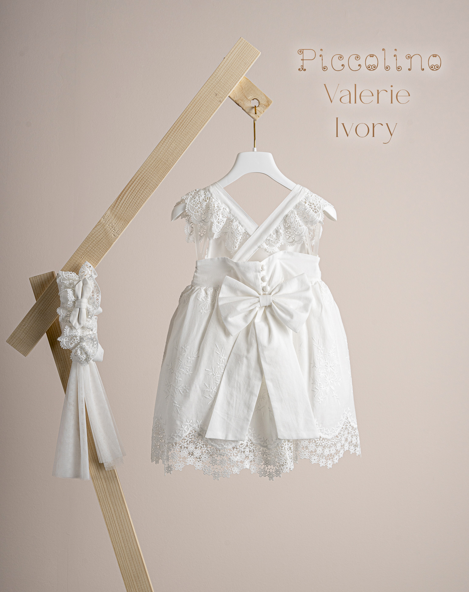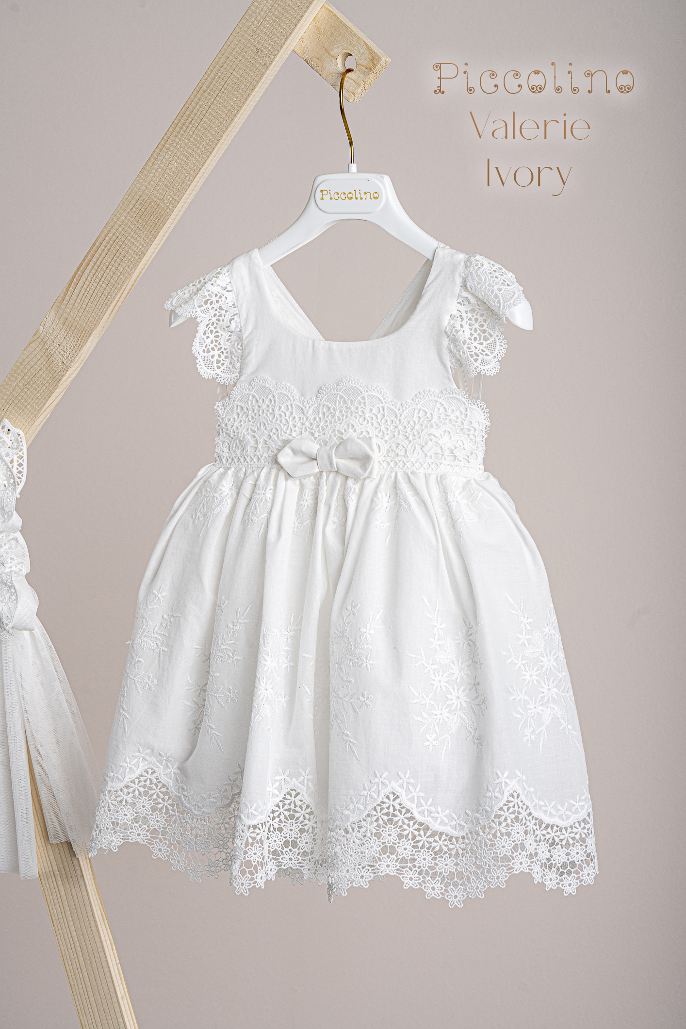 Βαπτιστικό φόρεμα Piccolino Valerie Ivory. Φόρεμα απο εκρού κηπουρ δαντέλα στο μπούστο και εκρού κηπούρ δαντέλα με όμορφο τελείωμα στη φούστα. Πλάτη με δέσιμο χιαστί απο τις τιράντες και δαντελένια μανικάκια.Την πίσω μεριά του φφορέματος διακοσμεί ένας ρομαντικός φιόγκος. Το ντεκόρ του φορέματος αποτελείται απο το δαντελένιο ζωνάκι και από το μικρό διακριτικό φιογκάκι. Το φόρεμα συνοδέυεται απο μπαντάνα με ντεκόρ όμοιο με το φόρεμα.