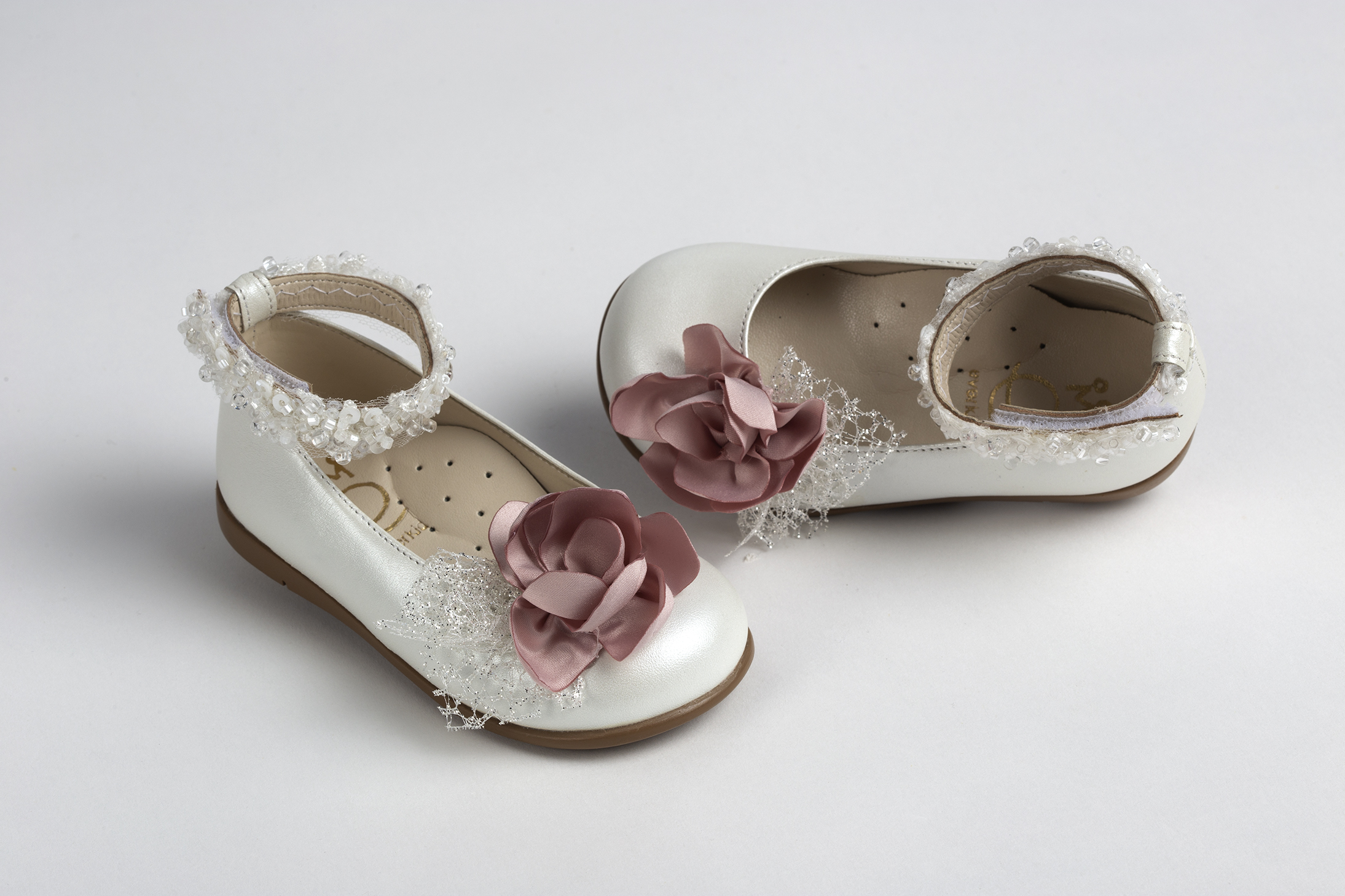 Μπαλαρίνα περπατήματος σε εκρού δέρμα διακοσμημένη με τρέσα και σάπιο μήλο λουλούδι. Νούμερα 19 – 27.
