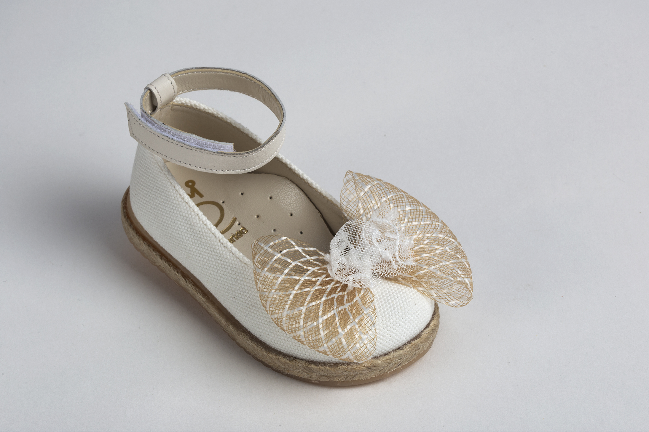 Μπαλαρίνα περπατήματος από την Everkid σε λευκό καμβά διακοσμημένη με μπεζ φιόγκο. Νούμερα 19 – 27.
