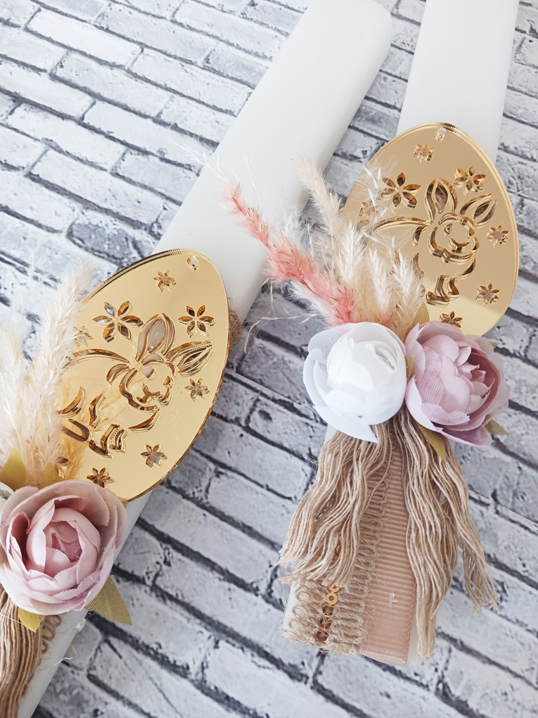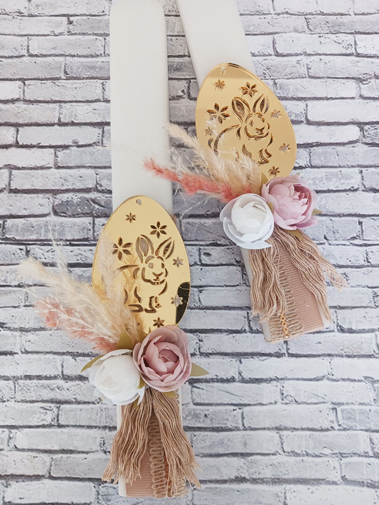 Πασχαλινή λαμπάδα λευκή με κουνελάκι από πλέξι γκλας χρυσό στολισμένη με λουλούδια και pampas.