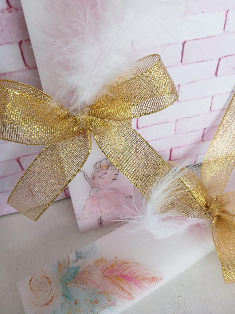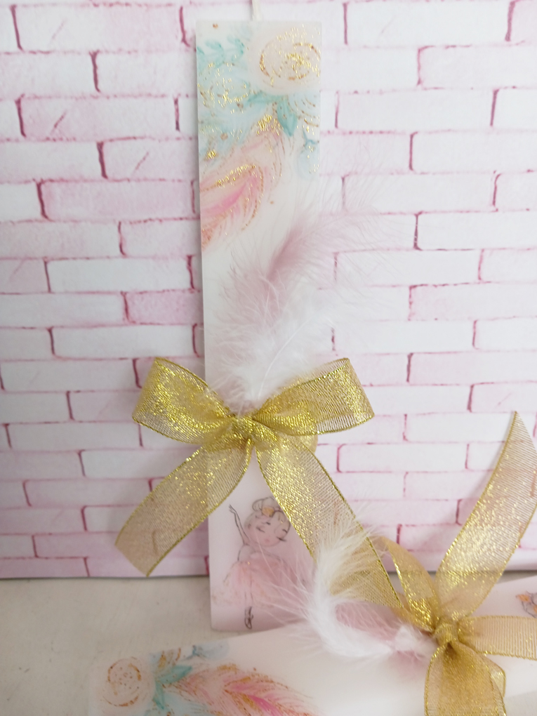 Πασχαλινή Λαμπάδα λευκή με εκτύπωση μπαλαρίνα, στολισμένη με κορδέλα χρυσή και πούπουλο.
