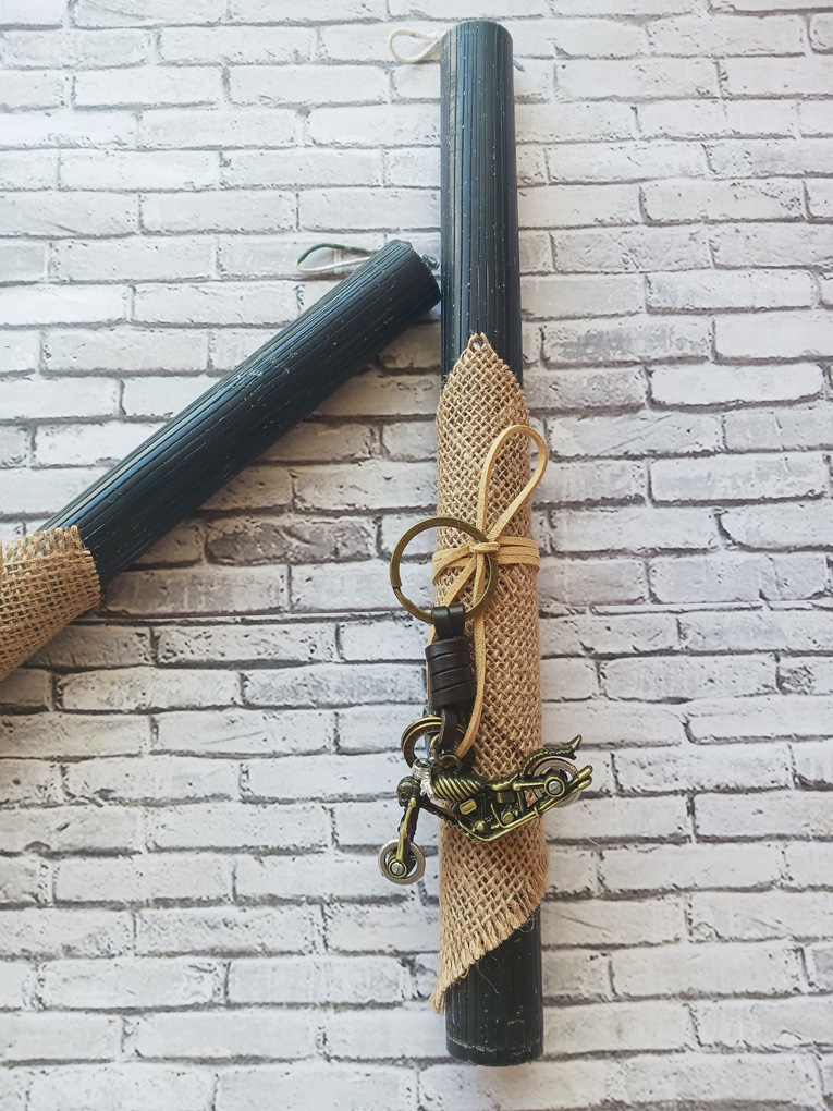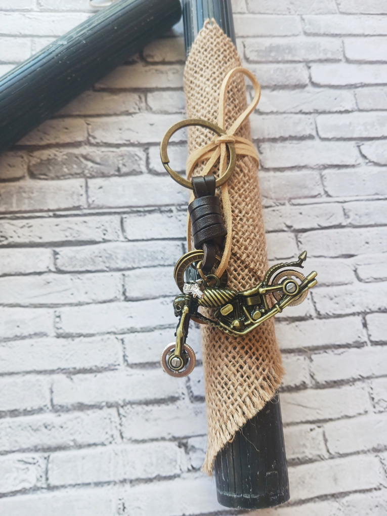 Πασχαλινή λαμπάδα μαύρου χρώματος με μπρελόκ μηχανή από μέταλλο και δέρμα. Στολισμένη με κορδόνι σουέτ και ύφασμα λινάτσας.