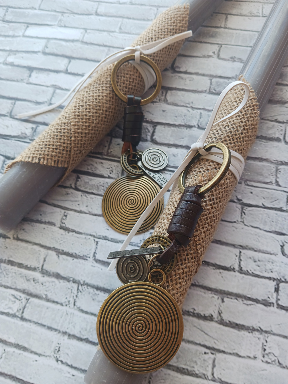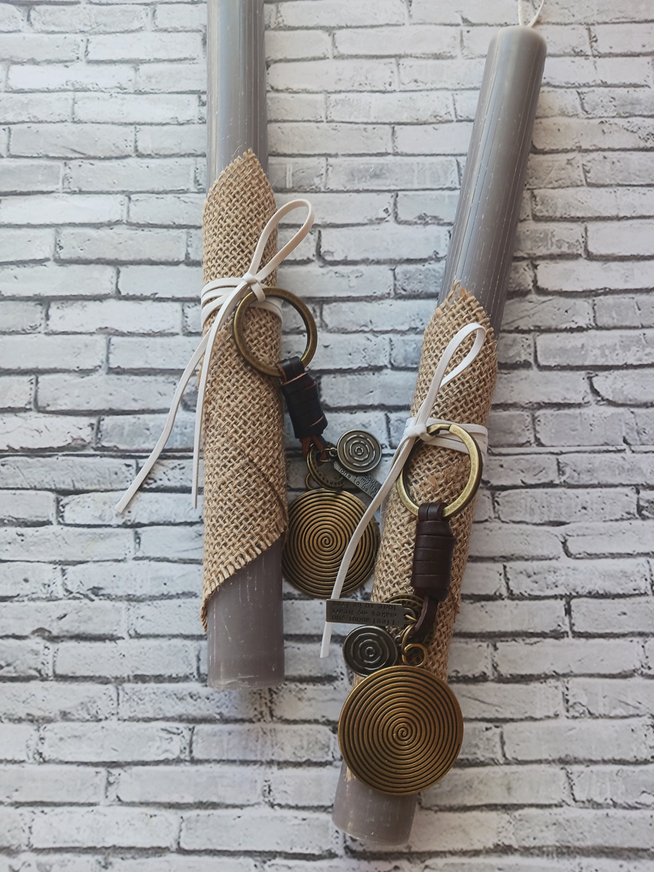 Πασχαλινή λαμπάδα γκρι χρώματος με μπρελόκ από μέταλλο και δέρμα. Στολισμένη με κορδόνι σουοτ και ύφασμα λινάτσας.