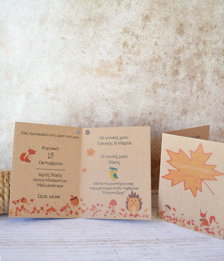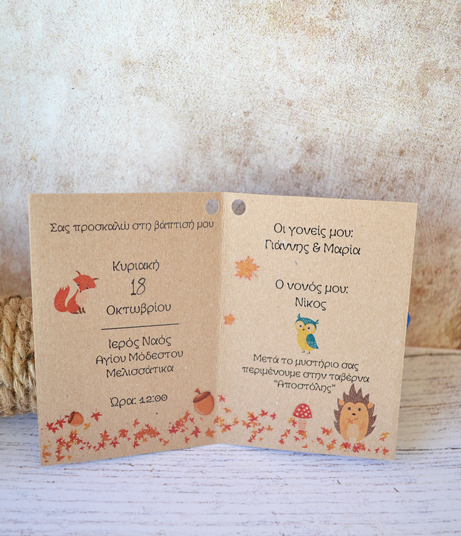 Προσκλητήριο βάπτισης οικονομικό με θέμα ζωάκια του δάσους σε διαστάσεις 15χ10 εκ.