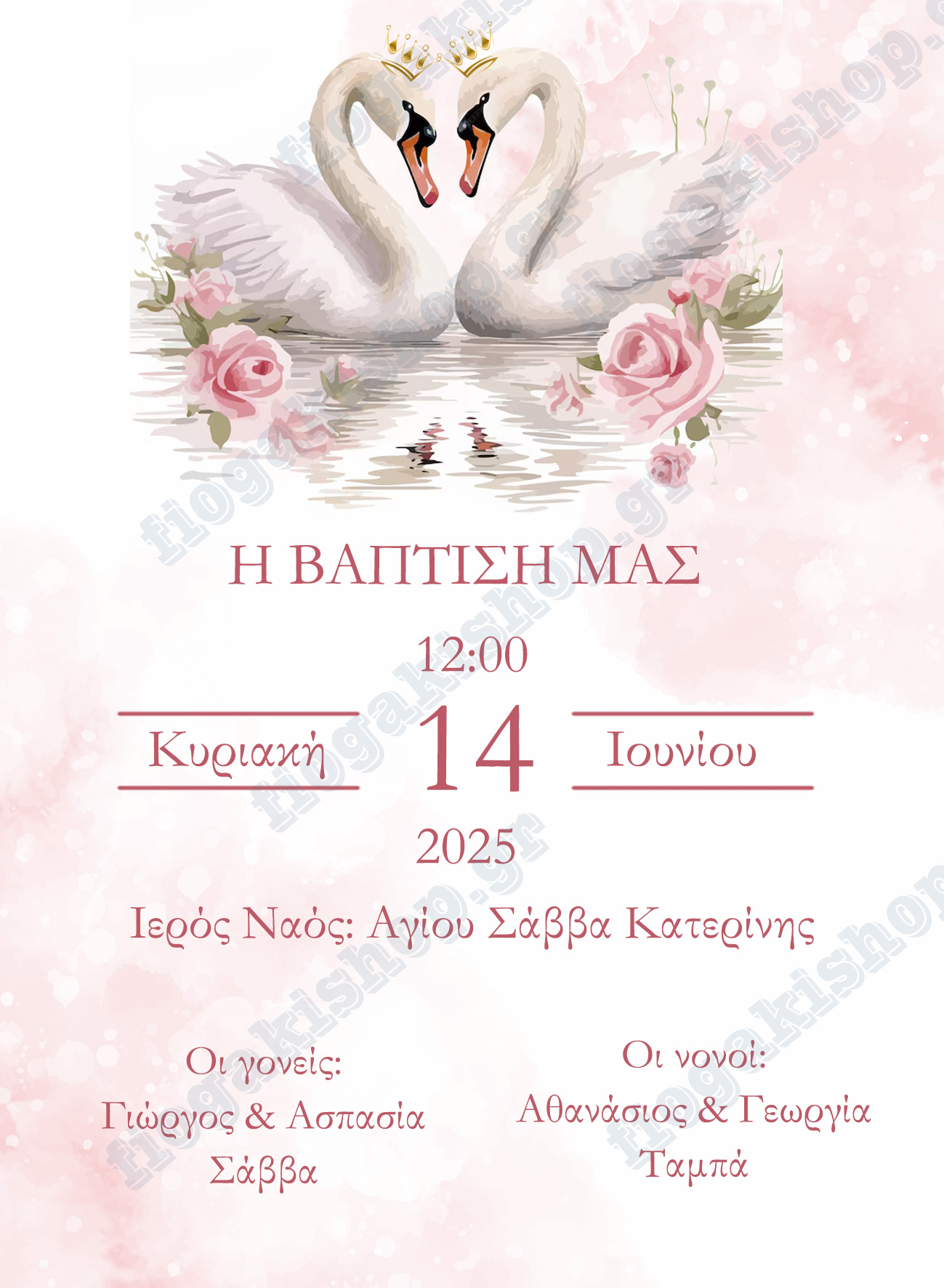 Προσκλητήριο βάπτισης οικονομικό με θέμα κύκνοι σε διαστάσεις 15χ11 εκ.. Μπορείτε να το τυλίξετε σαν πάπυρο πάνω σε μπομπονιέρα ή και ξεχωριστά.