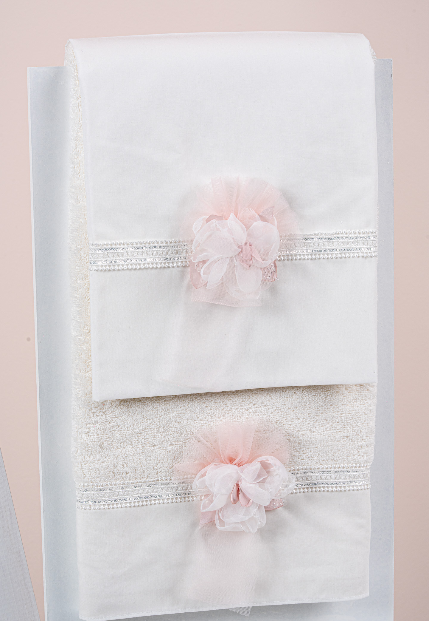 Σετ λαδόπανα Piccolino Filomena Pink. Αποτελείται απο βαμβακερό λαδόπανο, πετσέτα 140*70εκ, εσώρουχα και πετσέτα ιερέα 30*50εκ. Στολισμένα με χειροποίητα υφασμάτινα λουλούδια.